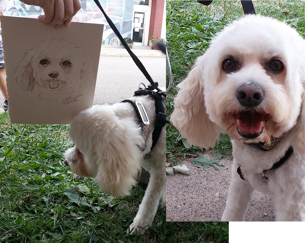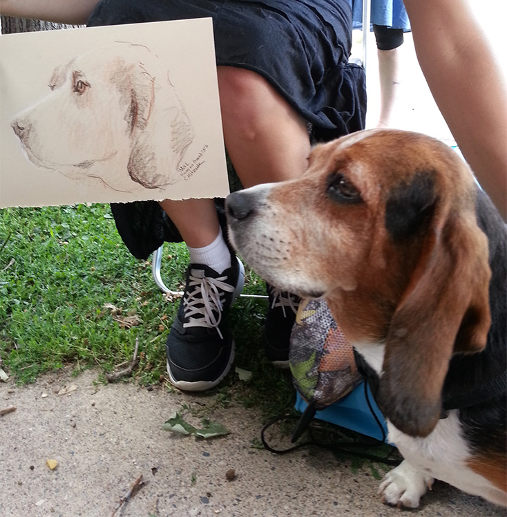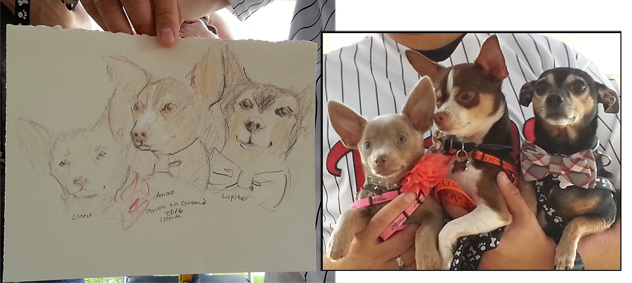 To get through the line of pets and owners we had to keep our sketch time with each sitter to 8-10 minutes max. Some dogs were okay with a stranger looking at them so I was able to sketch them from life, but many were not or were too excited/stressed or way more interested in the other dogs than in sitting still (totally understandable). For those dog sketches I used my phone’s camera to capture a pose and then drew from that while checking for color and uniqueness when I could entice the actual dog to look my way. Yay for technology! I must say there were so many very well behaved pets.