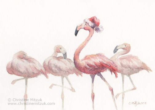 watercolor of a flamingo wearing a Santa hat and strutting his stuff while other flamingos look surprised by Christine Mitzuk