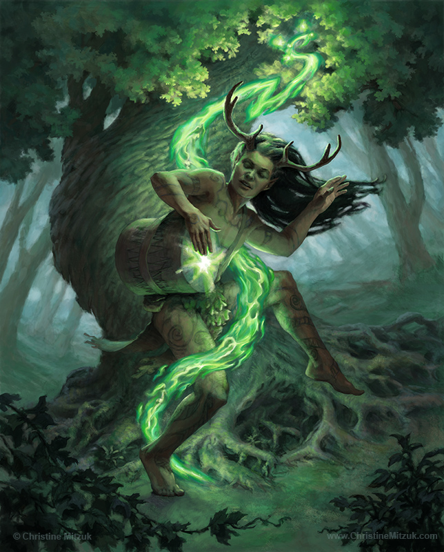 digital painting of earth elemental man with antlers surrounded by green flame playing the drum by christine mitzuk