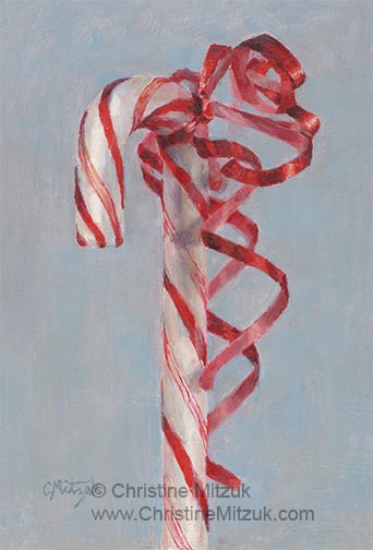 candy cane oil painting front of greeting card
