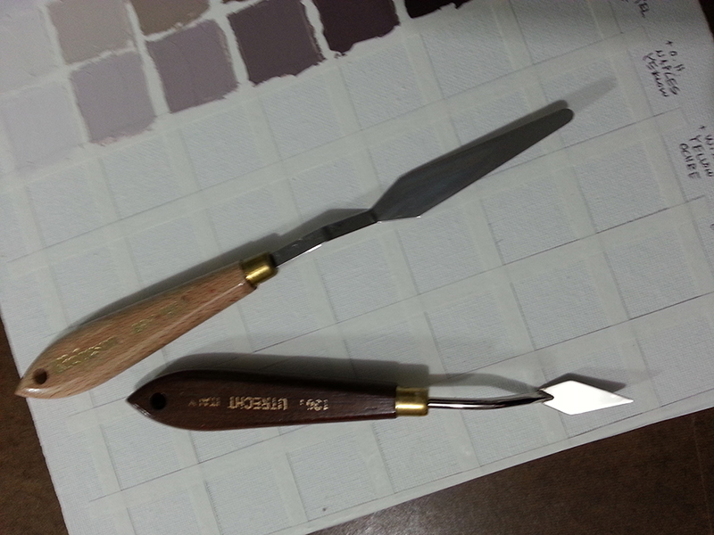 - I broke a palette knife. The smallish diamond shaped one at the bottom of this photo. I was applying too much pressure through my arm to incorporate the paint. The longer palette knife is working much better. The flexibility of the blade does most of the work of mixing. I still use a smallish diamond shaped palette knife to apply the mixtures to the squares.