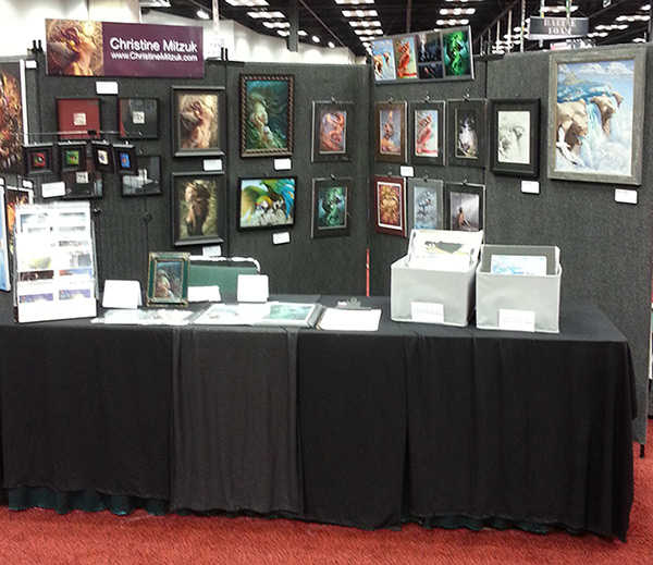 Originally my space looked like this. Bear falls drawing and painting on the left. Next my other larger framed art (canvas prints and original), then matted prints, then the dragon eye drawings. With this view, very few people noticed the Bear Falls painting. It’s pretty big so that seemed strange. I thought by putting the painting facing out to the main walkway (off the photo to the right), people might be drawn in. Not so. I don’t think it jumps out from the visual chaos that is Gen Con. Plus I think people on the main walkway had a destination in mind so weren’t sightseeing. Plus it seemed that most of the traffic was moving out of the Artist Alley toward the main walkway, not in.