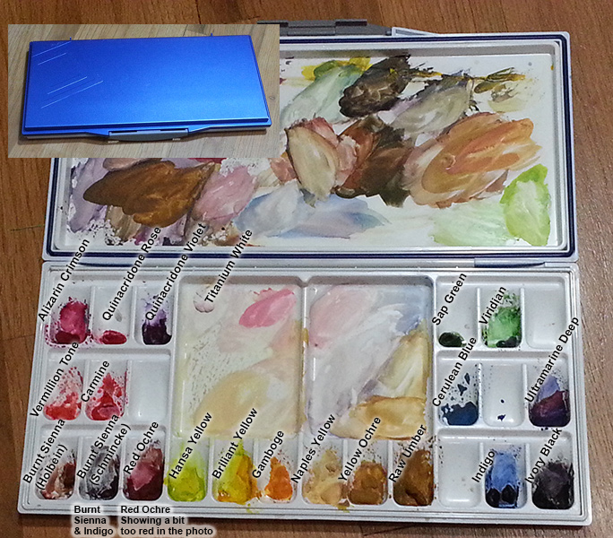 I’m sure this palette will change over time. Right now it allows me to use Paxton Palette colors, or go for the warm and cool color combinations (Alizarin and Vermillion, Gamboge and Brilliant Yellow or Hansa, Cerulean and Ultramarine, Sap Green and Viridian). Does anybody have a color recommendation they think I might like to try?