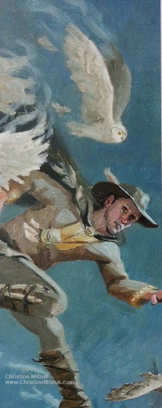 Finding a balance between imagination and realism. After the lay-in (getting a first layer to start setting up value and color relationships) this time I decided to tackle the flesh tones in the face first before developing other areas. I’m trying for a dusk or night time look so I mixed a “flesh” color first and then added some different blues and maybe a little Raw Umber to shift the color to look like a moonlit situation. Trial and error, experimentation. I like what I found.