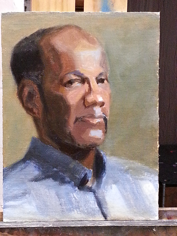 I try to block in the big shapes, thinking about value first and then color. Going for unity first (the variety will come later). I try to keep in mind where the light source is, and how it hits the planes of the face. If I think about the vertical corridors of value groupings, I’m better able to keep the planes and shapes in their families of value.