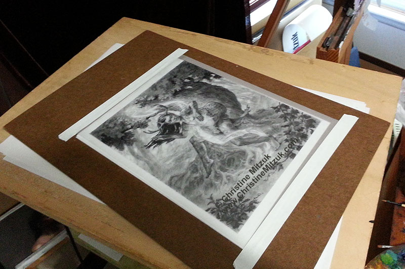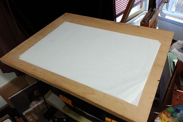 Next, while it was still a little warm, I “stretched” the drawing by making a small stack of 8.5″x11″ paper (5-10 sheets), then taped the drawing to a board over the stack along the top and lower edges of the vellum.