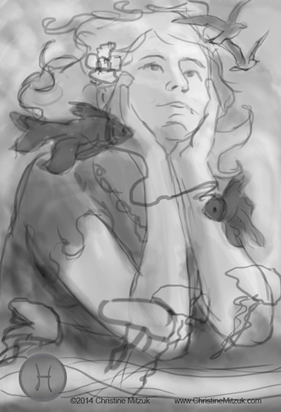 She started out as a rejected sketch from the astrology calendar project. This was an early concept for the Pisces image. The gulls, fish with connecting thread, jellyfish, and orchid in her hair are all symbols related to Pisces.