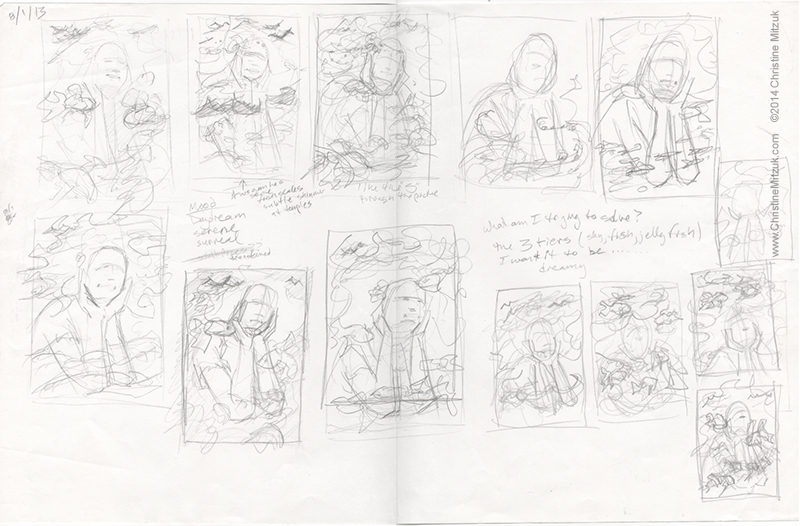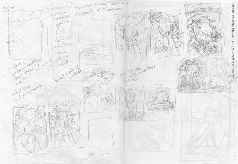To make it my own I decided that I wanted to play up the nebulous, dream-like quality. I needed to figure out how to create that feeling so I did lots of thumbnails. I also brainstormed words that I thought related to the sea and the quality/mood I was after.