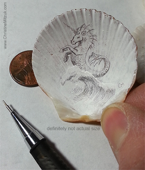 Here’s a peek at one of the pieces I’ve made. It’s a tiny silverpoint drawing done in a shell. For this one I brushed onto the shell a little Silverpoint Drawing Ground. Each piece is framed with frames that have a hint of weathered beach cottage about them.