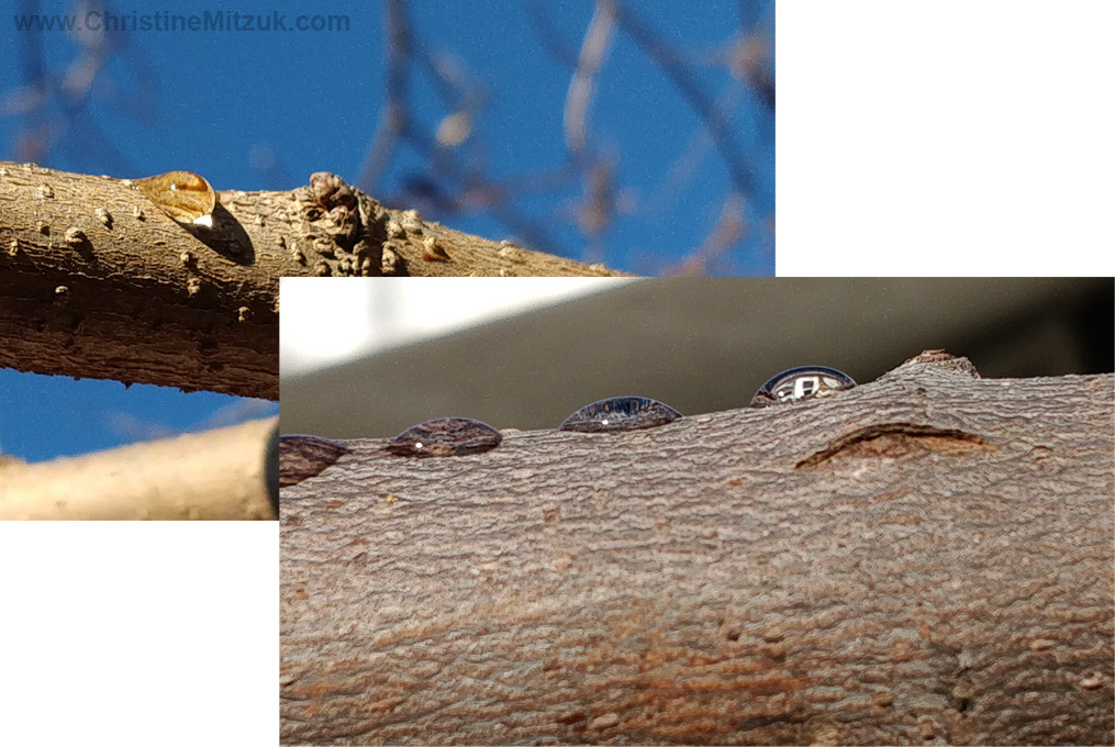I also collected more reference. I needed more information about water on leaves, how the light and values might work. I also needed information about water drops on a branch so I looked at pictures and created my own on a branch outside. This was helpful because it gave me a better idea of what happens to things seen in or through a water droplet.