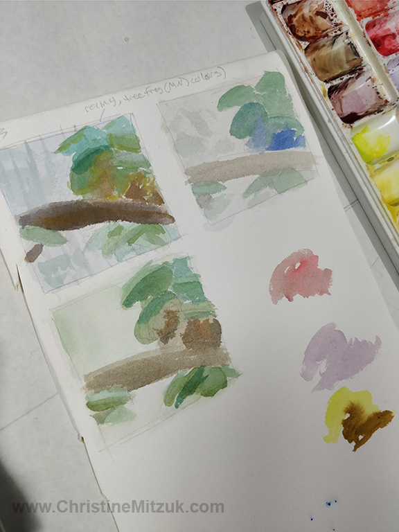 After doing the tighter line drawing, I created some color studies. This helped me figure out values for the final as well as coloration. I was thinking of the gray treefrogs I’ve seen around Minnesota.