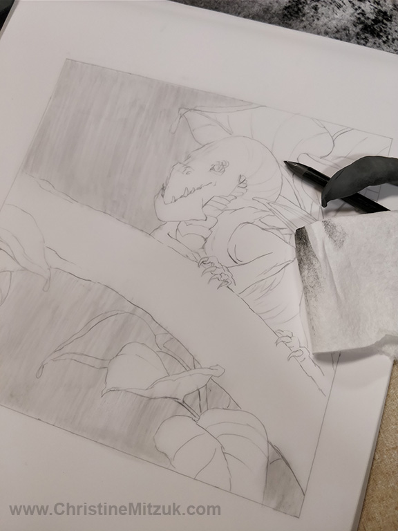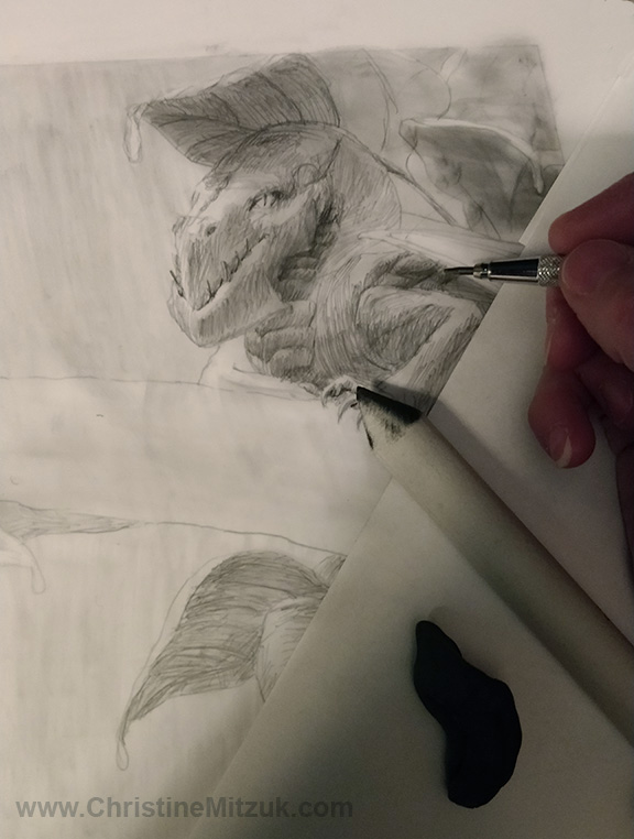 This is part 3 in a series of posts sharing much of the creation process for my Rainy Day Dragon. The final drawing was jurried into the Not So Tiny Dragons book for ArtOrder, LLC’s TIny Dragon Art Project Kickstarter. In the previous post I showed you the start of the drawing. This week’s post gives a look at the tighter drawing, and color ideas for the painting.
