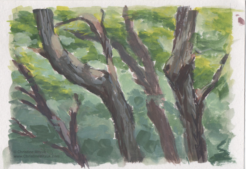 Here’s my little painting: 5″x7″, gouache on Jack Richeson Finest Studio Watercolor Paper. Roz Stendahl has a thorough review of the paper on her blog. It’s a recycled paper made of 100% post-consumer waste, Cold Press and acid free.