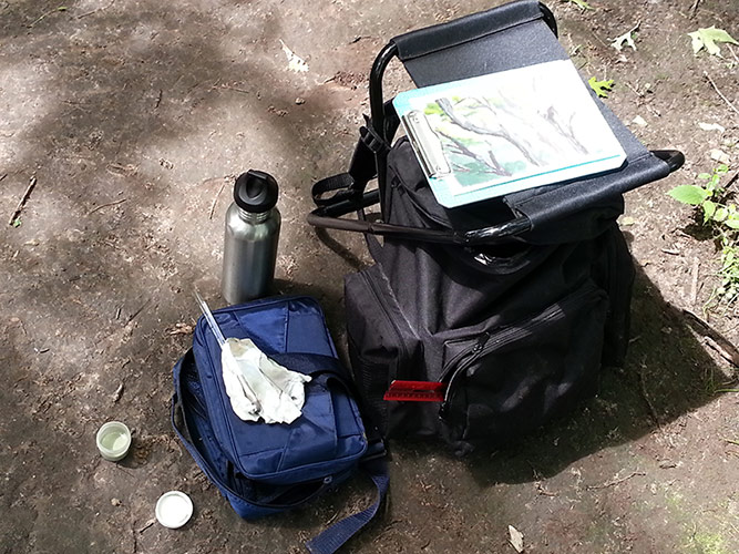 Not bad. I ended up putting the little kit in my backpack stool. I decided to take the backpack so I could bring a water bottle, some sun screen, and a jug to carry my dirty water, plus a 12″ ruler to measure off my working area. Sorry but the dirty water jug is in the backpack. It’s an accordion storage bottle I bought ages ago from a photography supply shop. I take the dirty water home with me.