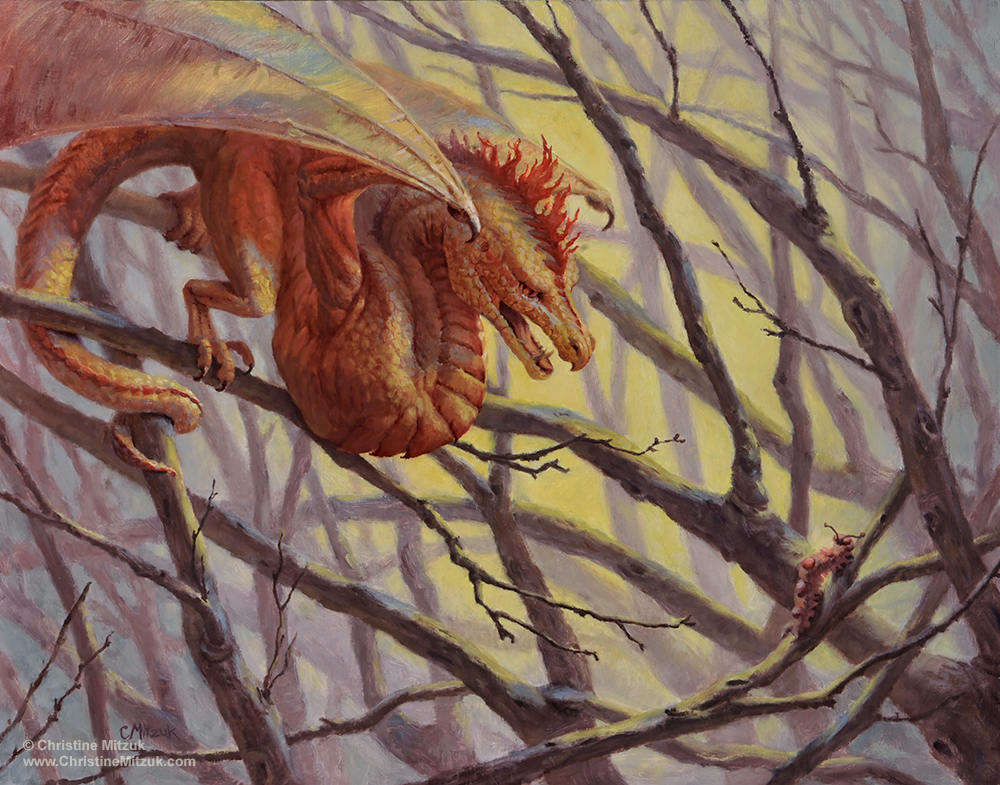 I finished this piece back in May. Wyvern Hunting is now varnished, framed, and ready for display at Gen Con. Loose prints area available through my online store, and I will have both loose and matted prints with me for sale at Gen Con.